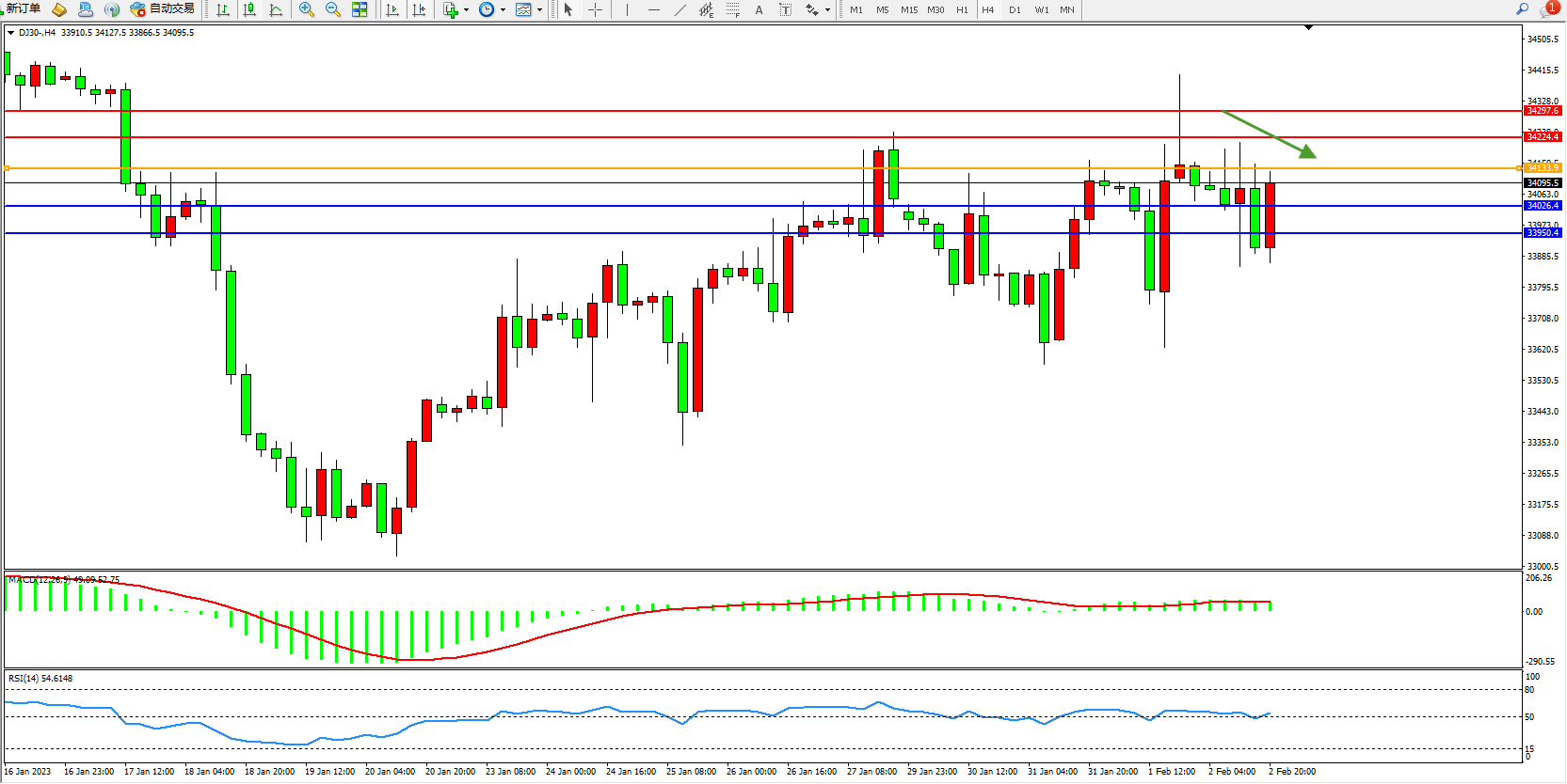 道琼斯指数2月2日(周四)收盘下跌39.22点,跌幅0.12%,报34053.74点;美国至1月28日当周初请失业金人数 18.3万人,预期20万人,前值18.6万人。美国初请失业金人数在五周里第四次下降,凸显出就业市场存在广泛韧性,这可能会使通胀持续居高不下。