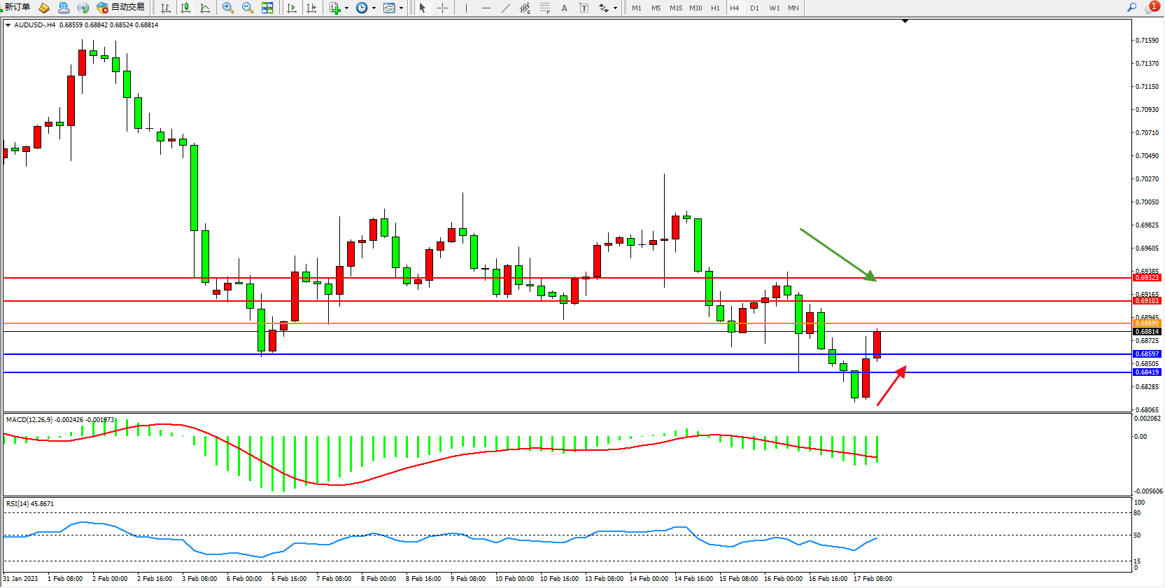 备选策略:0.68890上方看涨,目标0.69103、0.69323