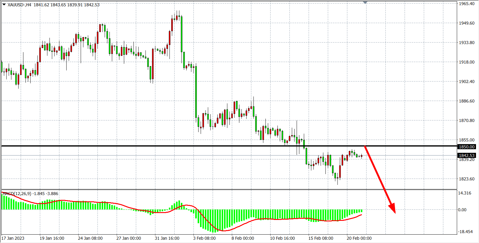 4小时图看,金价在1850之下受阻后继续走低,MACD在零轴之下呈放量状态,行情短线依旧延续弱势,空头趋势延续,当前阻力关注1850,在该位之下继续看跌为主,下方目标1820-1800附近。