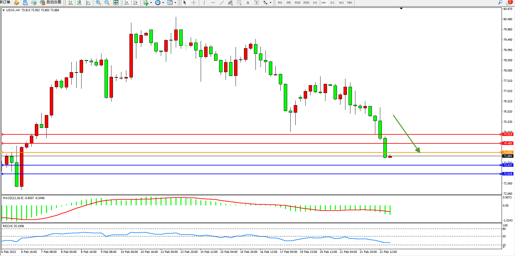 交易策略:74.050下方看跌,目标73.437、73.018