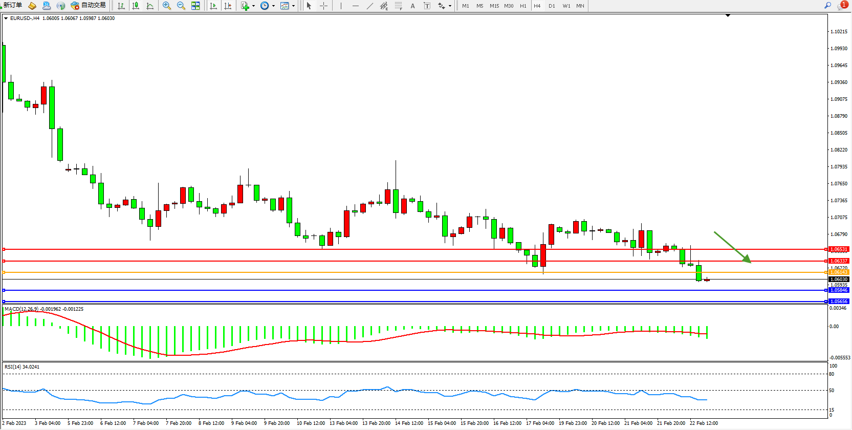 欧元美元EURUSD—4小时K线图显示: