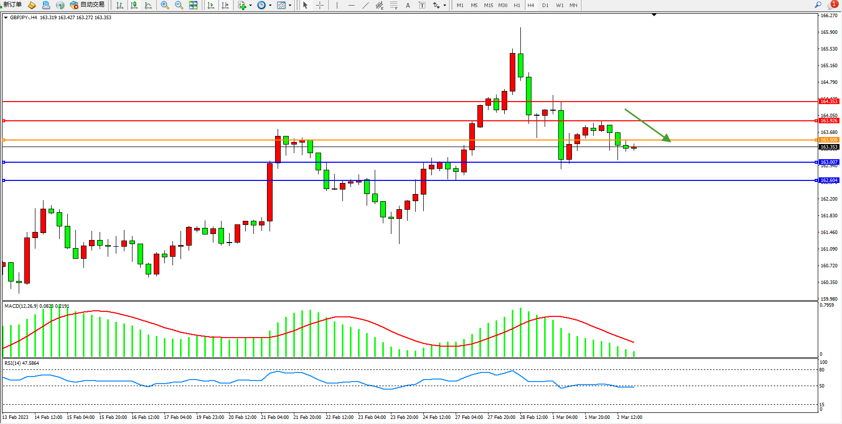 交易策略:163.500下方看跌,目标163.007、162.604