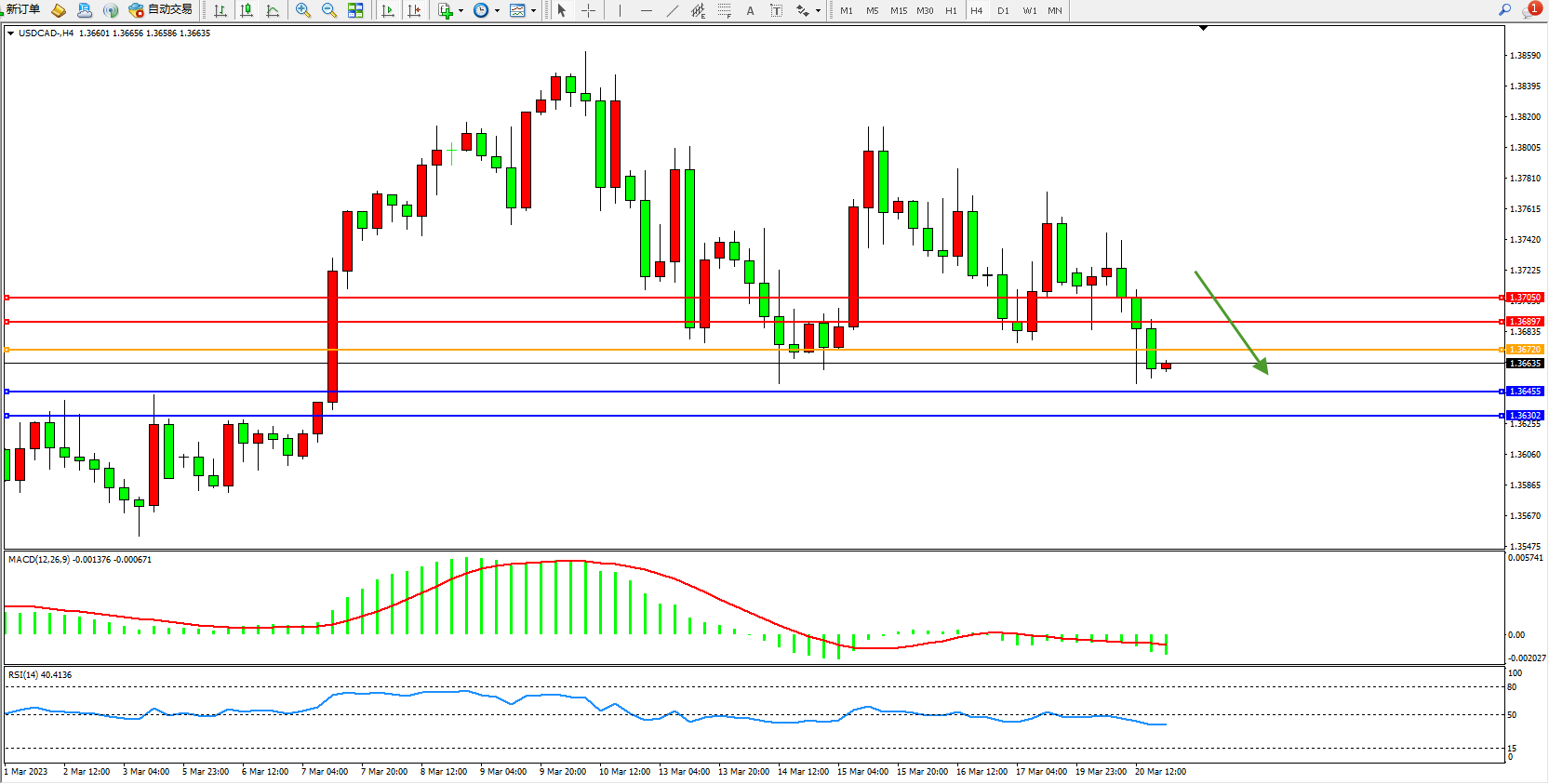 4小时图看:空头动力维持震荡下移,短期跌势或将延续,市场整体处于偏弱势下移,MACD指标处于0轴线下侧徘徊,RSI指标处于50均衡线下侧弱势整理;