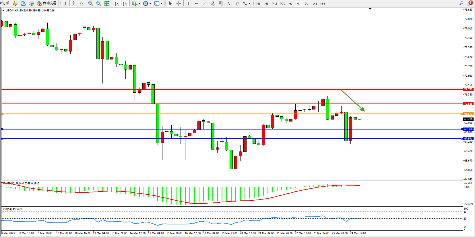 4小时图看:空头持续震荡下行,短期有继续向下移动态势,市场空头情绪开始涌现,MACD指标处于0轴线附近弱势徘徊,RSI指标处于50均衡线附近弱势整理;