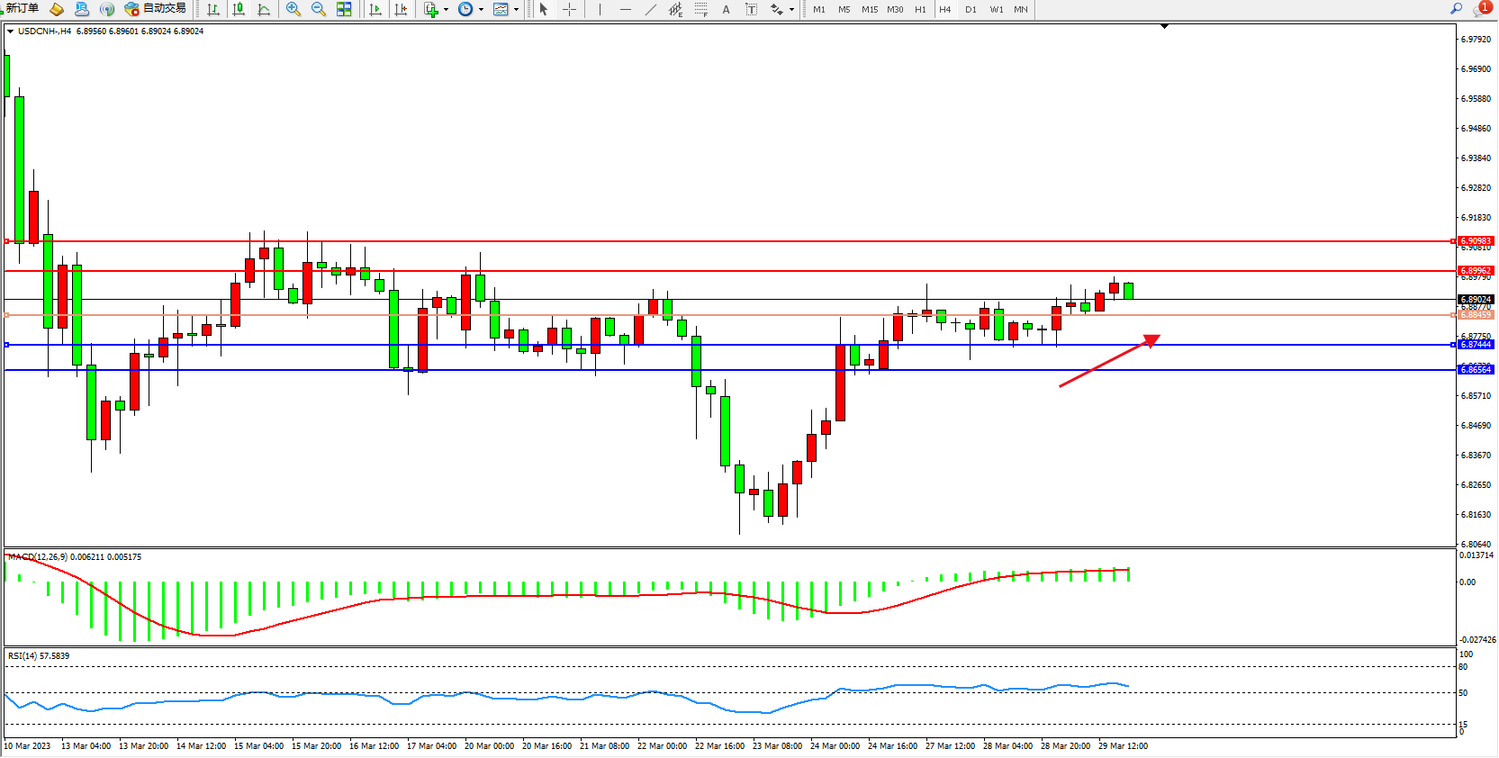 交易策略:6.88459上方看涨,目标6.89962  6.90983