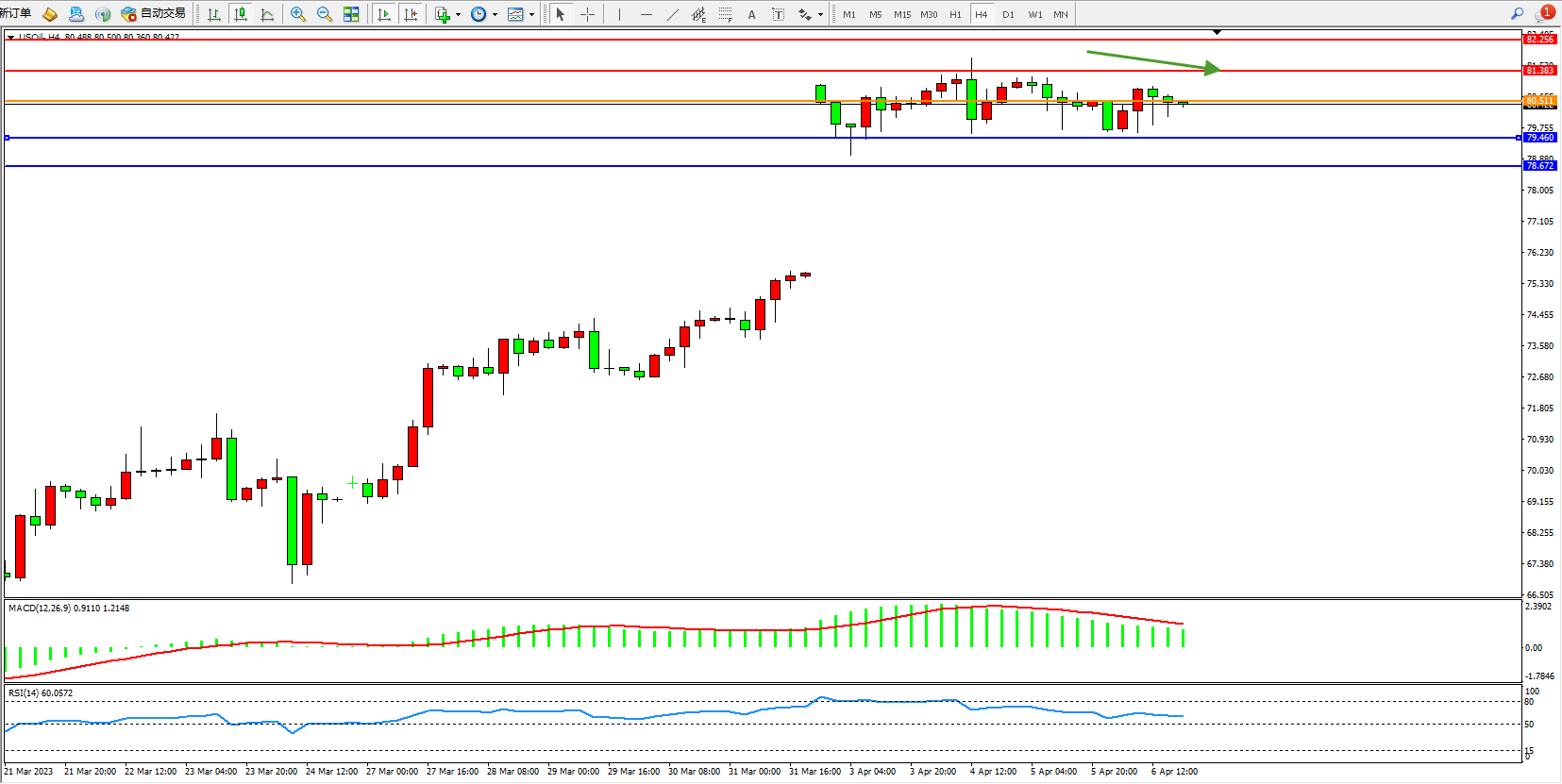 4小时图看:高位短期维持弱势徘徊,市场整体处于高位区间弱势震荡中,尚未走出高位震荡格局,MACD指标处于0轴线上側多头区域整理,RSI指标处于50均衡线上側弱势徘徊;