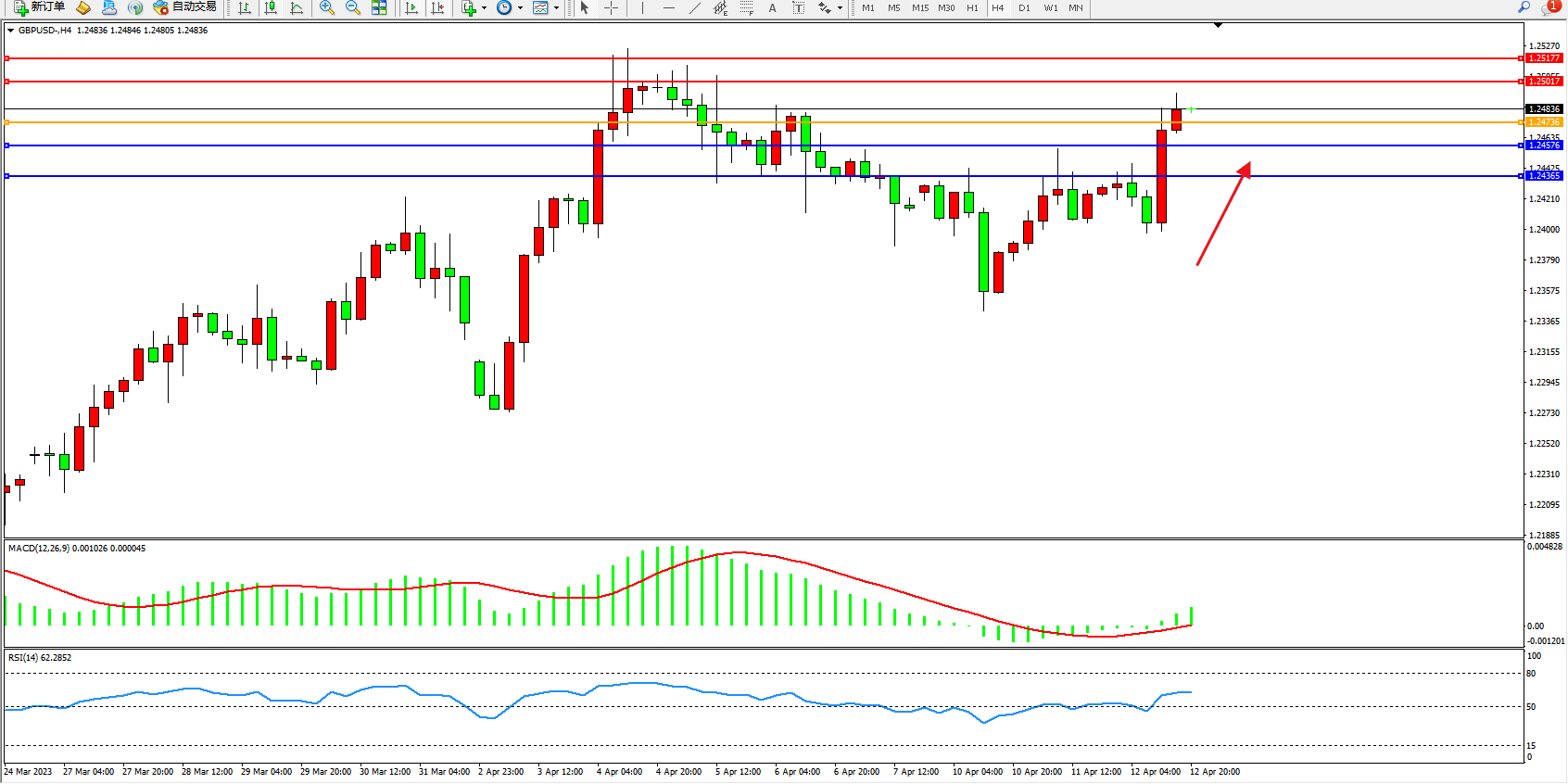 4小时图看:多头动力强势拉升上扬,短期看涨情绪笼罩,市场多头不断攀升中,MACD指标处于0轴线上側上移,RSI指标处于50均衡线上側徘徊;