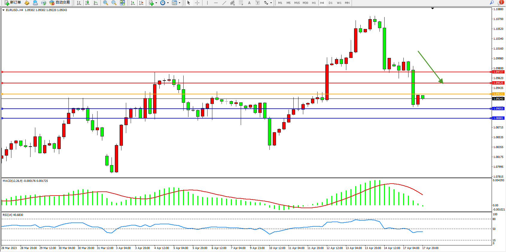 欧元美元EURUSD—4小时K线图显示: