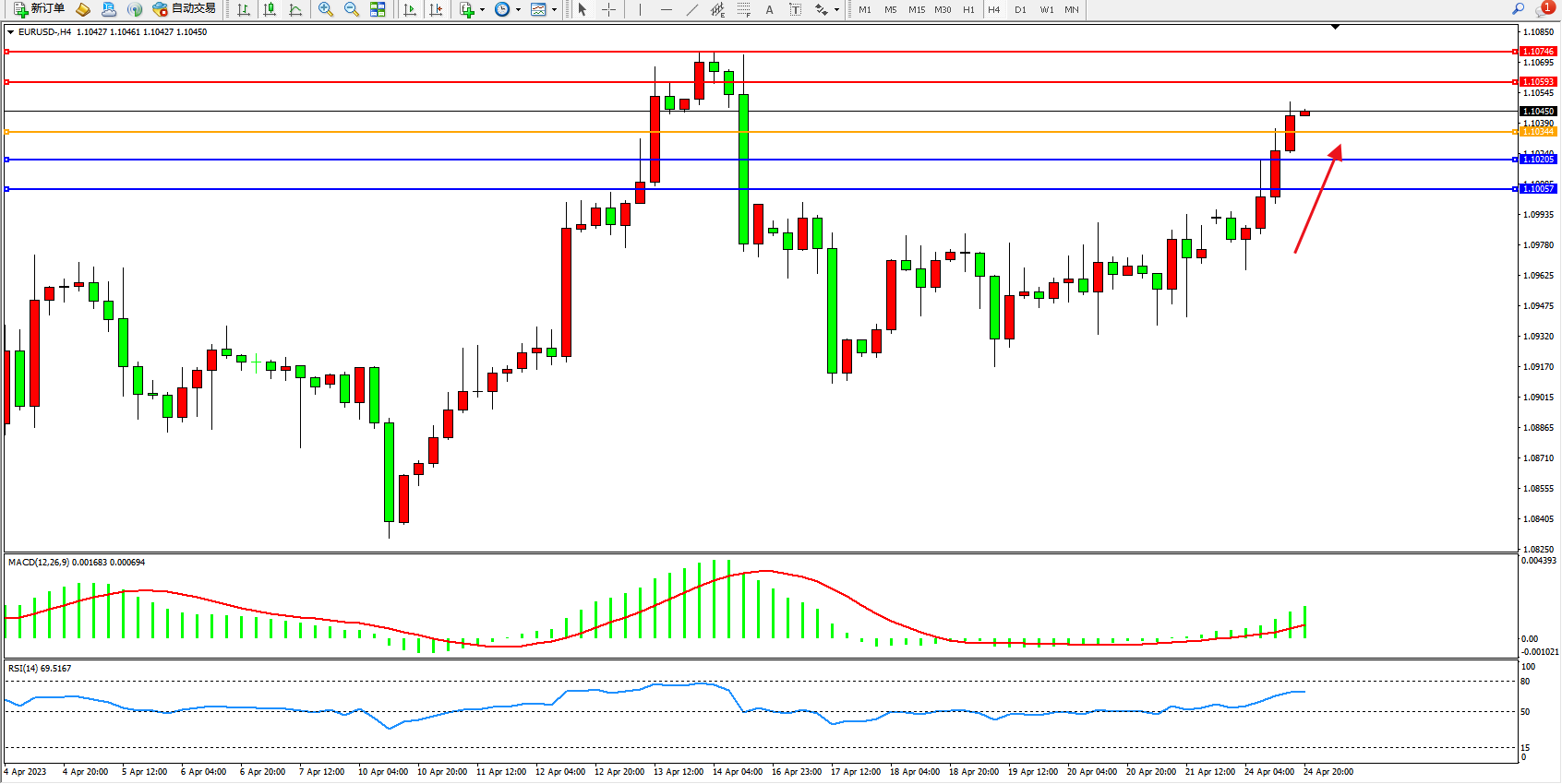4小时图看:多头动力维持震荡上扬,短期看涨情绪笼罩,市场多头不断攀升,即将突破前期高位节点,MACD指标处于多头区域持续上行,RSI指标处于多头区域持续拉升;
