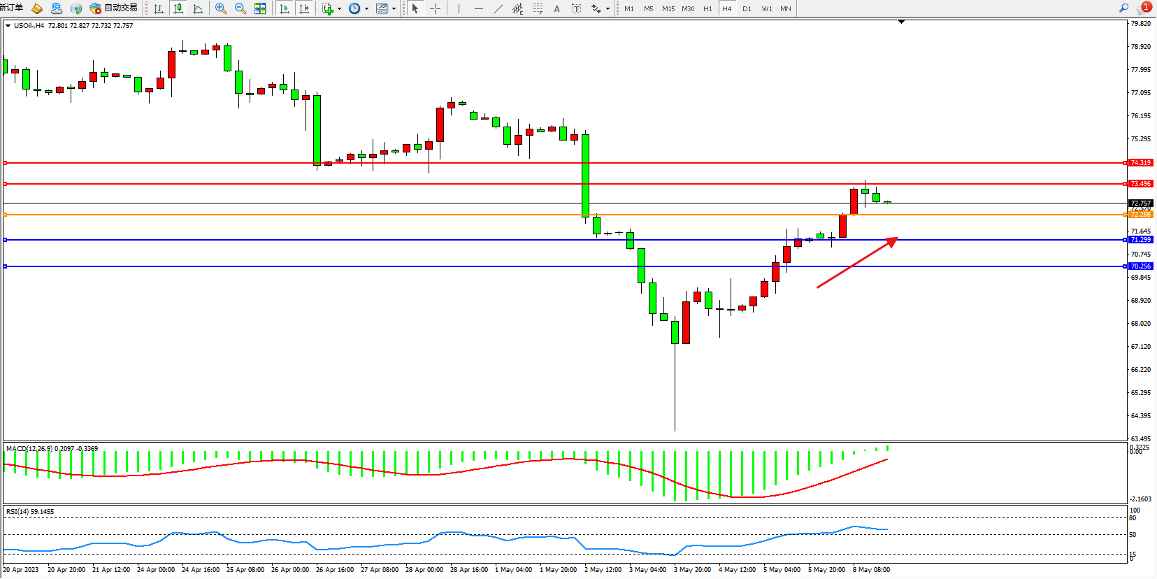 4小时图看:多头动力维持震荡上行,短期看涨情绪持续,市场多头态势良好,MACD指标持续震荡上移至0轴线上側徘徊,RSI指标处于50均衡线上側弱势整理;