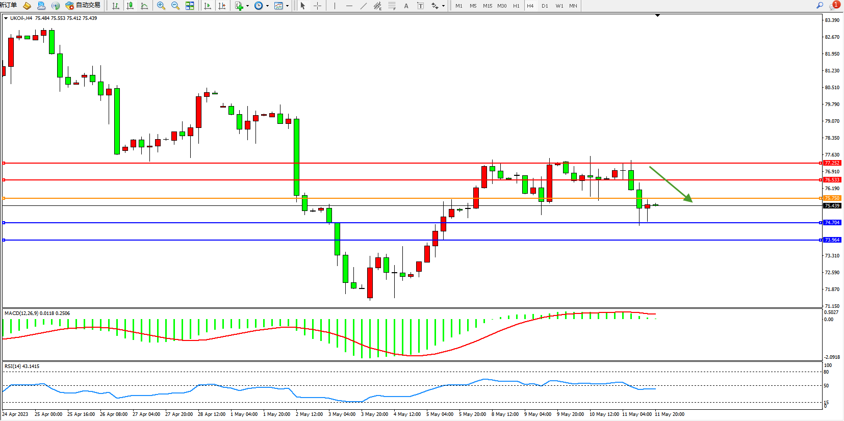 布油维持75.439附近震荡,布伦特原油价格已成功走出之前的超卖状态,但新的涨势有所停滞,因为受到尚未解决的(全球)银行业恐慌情绪的抑制。