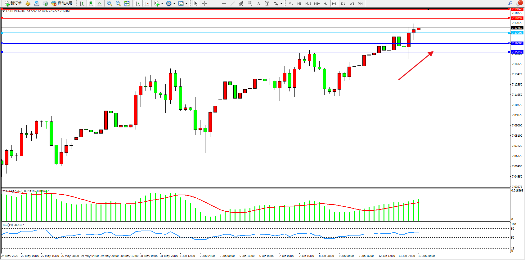 美元人民币USDCNH——4小时K线图显示: