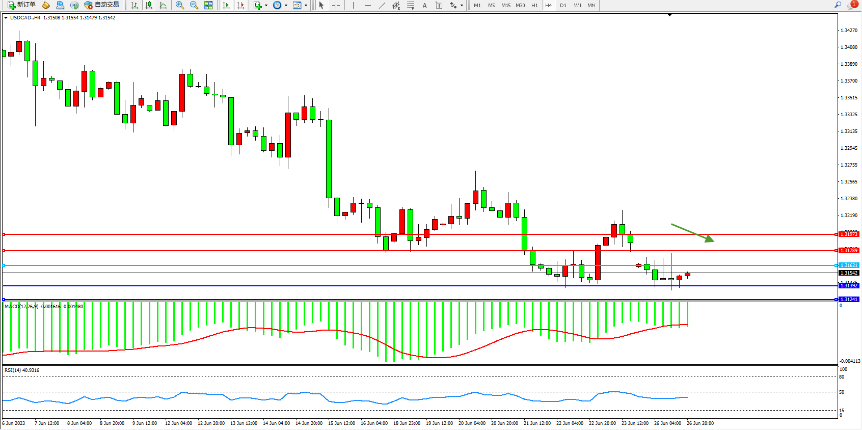 4小时图看:低位弱势整理,短期跌势或将持续,市场整体偏空头走势中,MACD指标处于空头区域整理,RSI指标处于50均衡线下侧弱势徘徊;