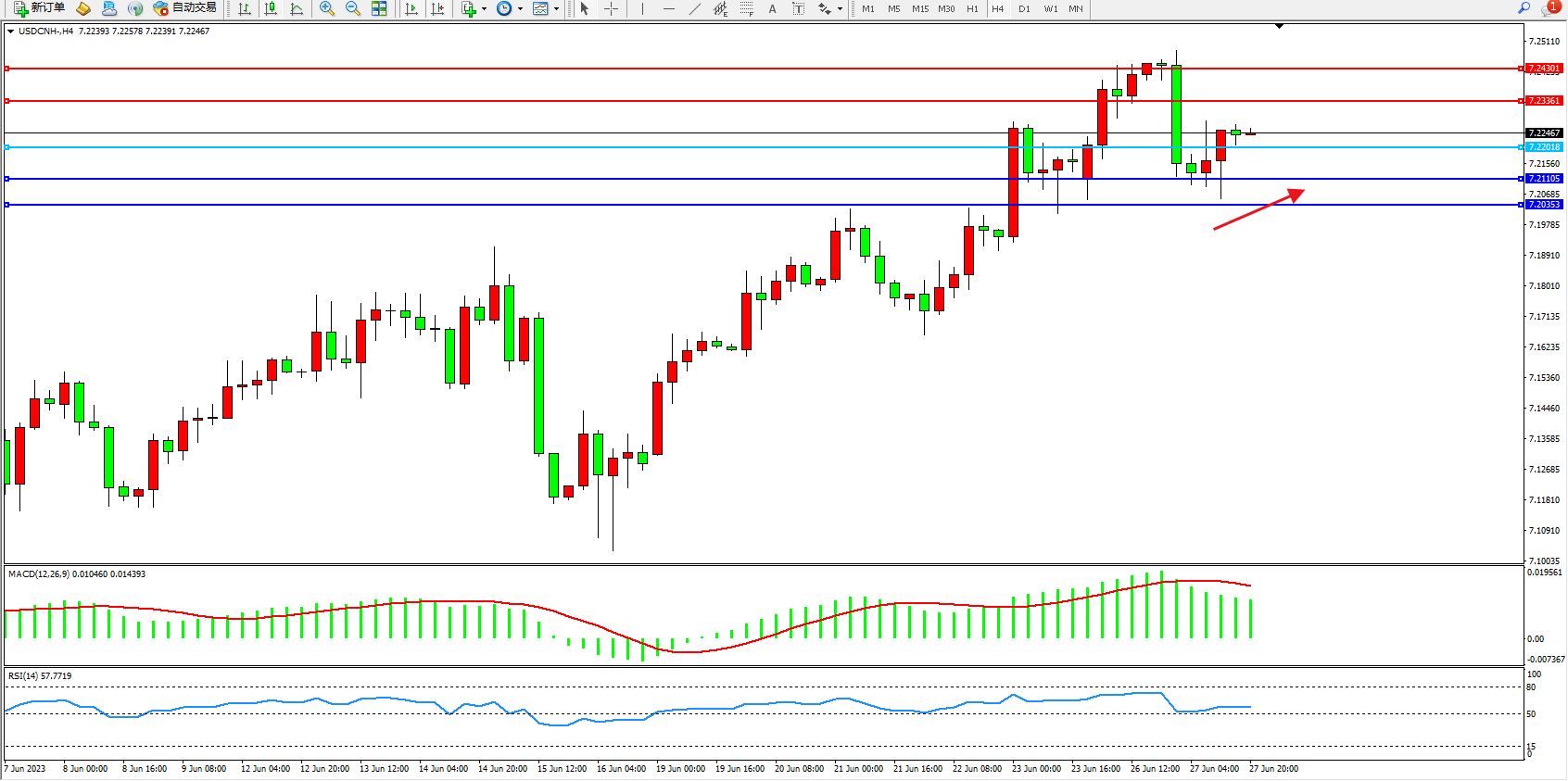 美元人民币USDCNH——4小时K线图显示: