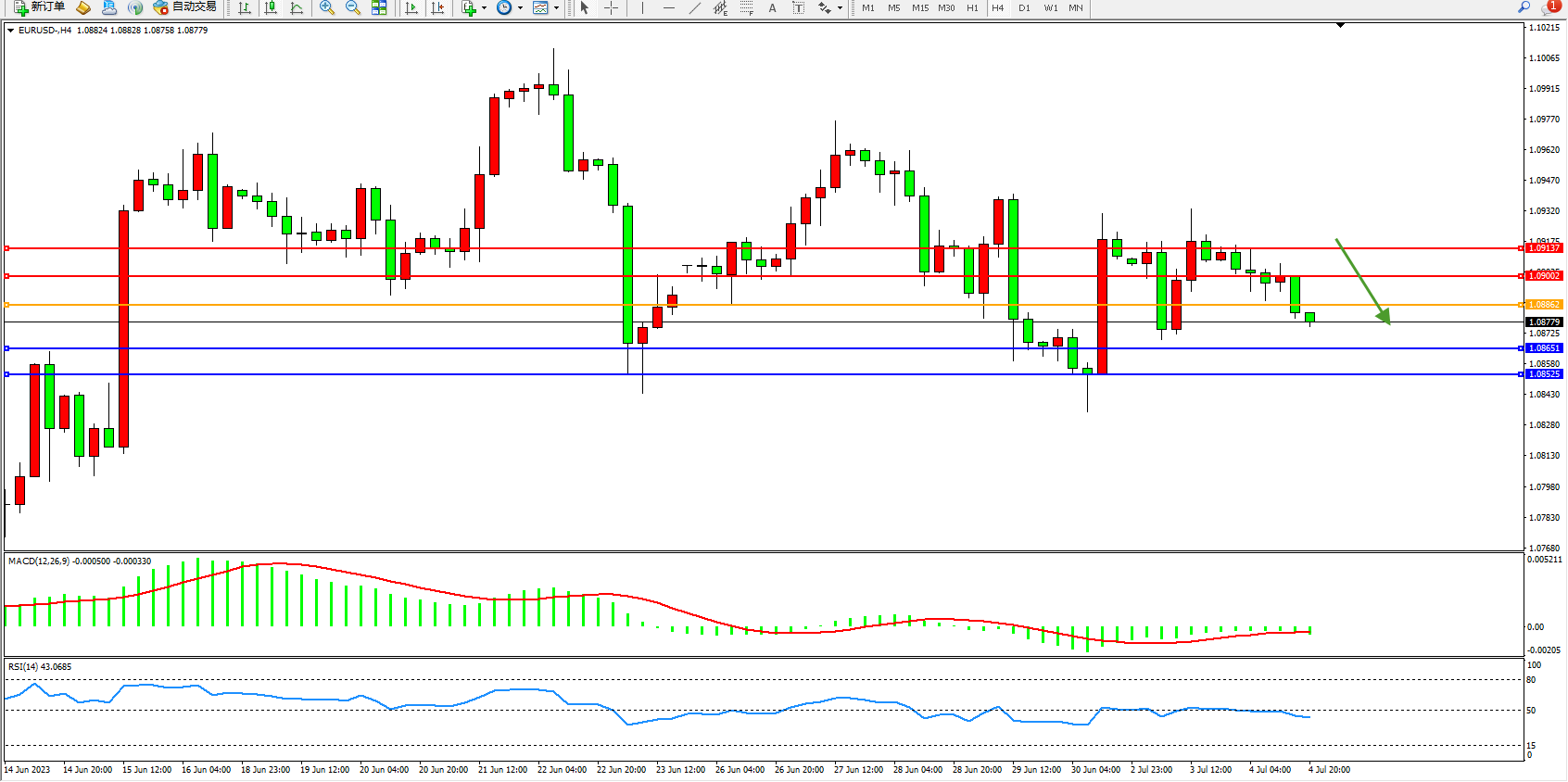 欧元美元EURUSD—4小时K线图显示: