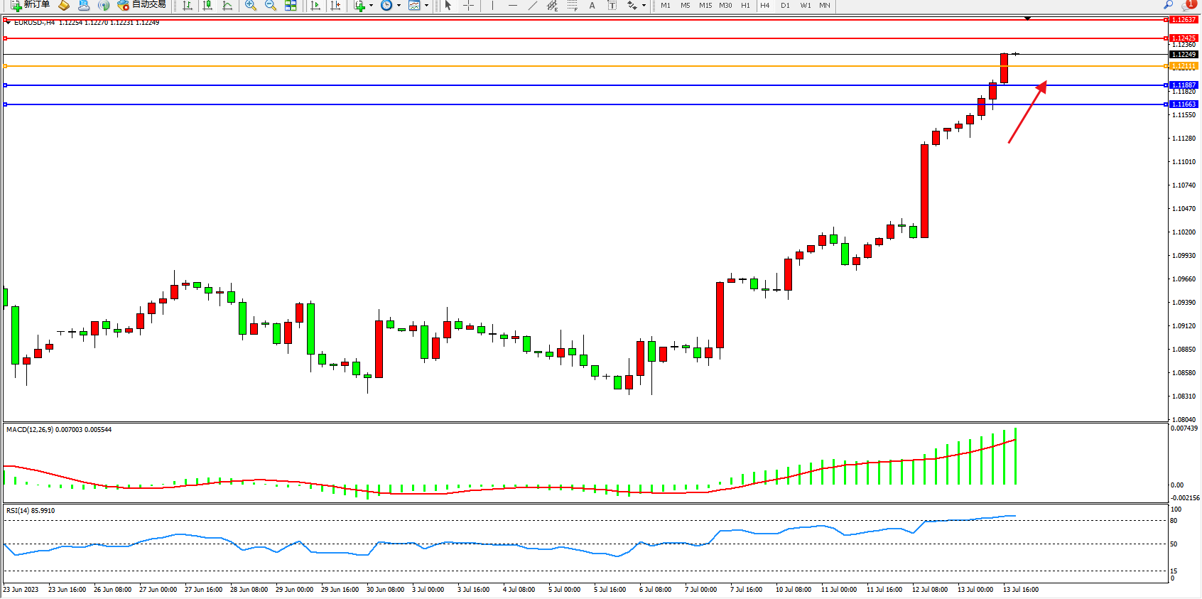 欧元美元EURUSD—4小时K线图显示: