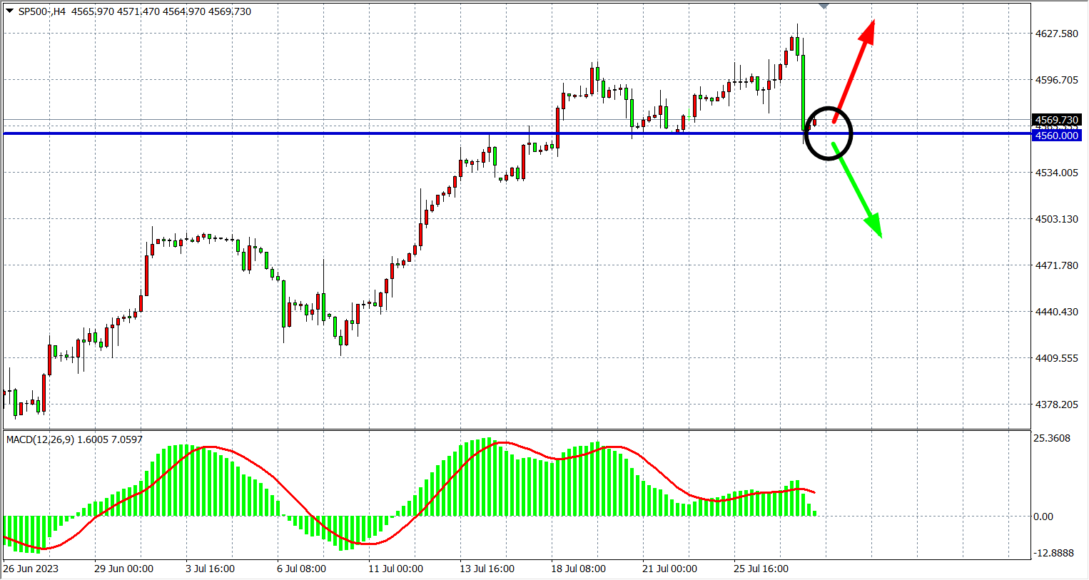 4小时图看,标普回调至4560支撑有效止跌,MACD量能在零轴上缩量,支撑继续关注4560附近,该位下破则继续看跌4500一线,该位不破看反弹4600-4630附近。