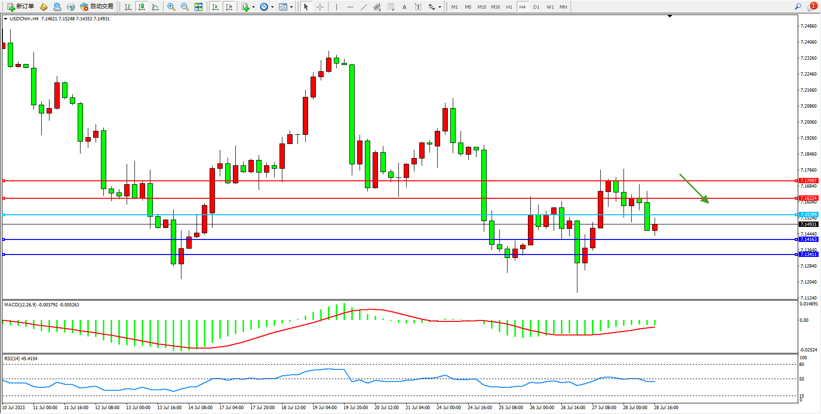 交易策略:7.15399下方看跌,目标7.14163 7.13411