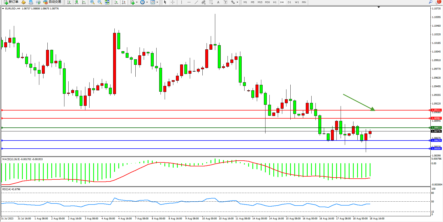欧元美元EURUSD—4小时K线图显示: