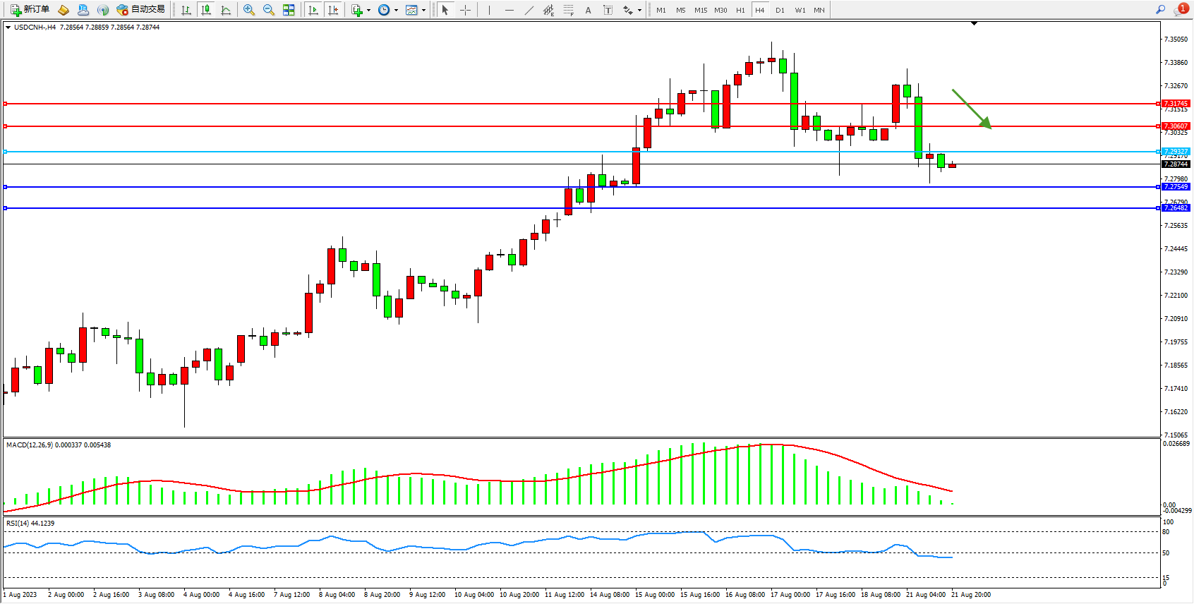 美元人民币USDCNH——4小时K线图显示: