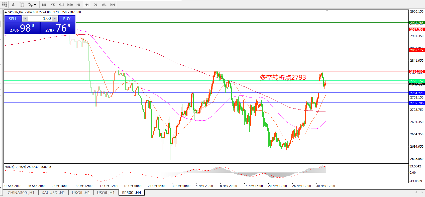 4小时图看,标普500突破阻力后快速连续拉升,前期阻力2793得而复失,短期走势强势震荡, MACD红柱增加,短期以逢低做多操作为主。