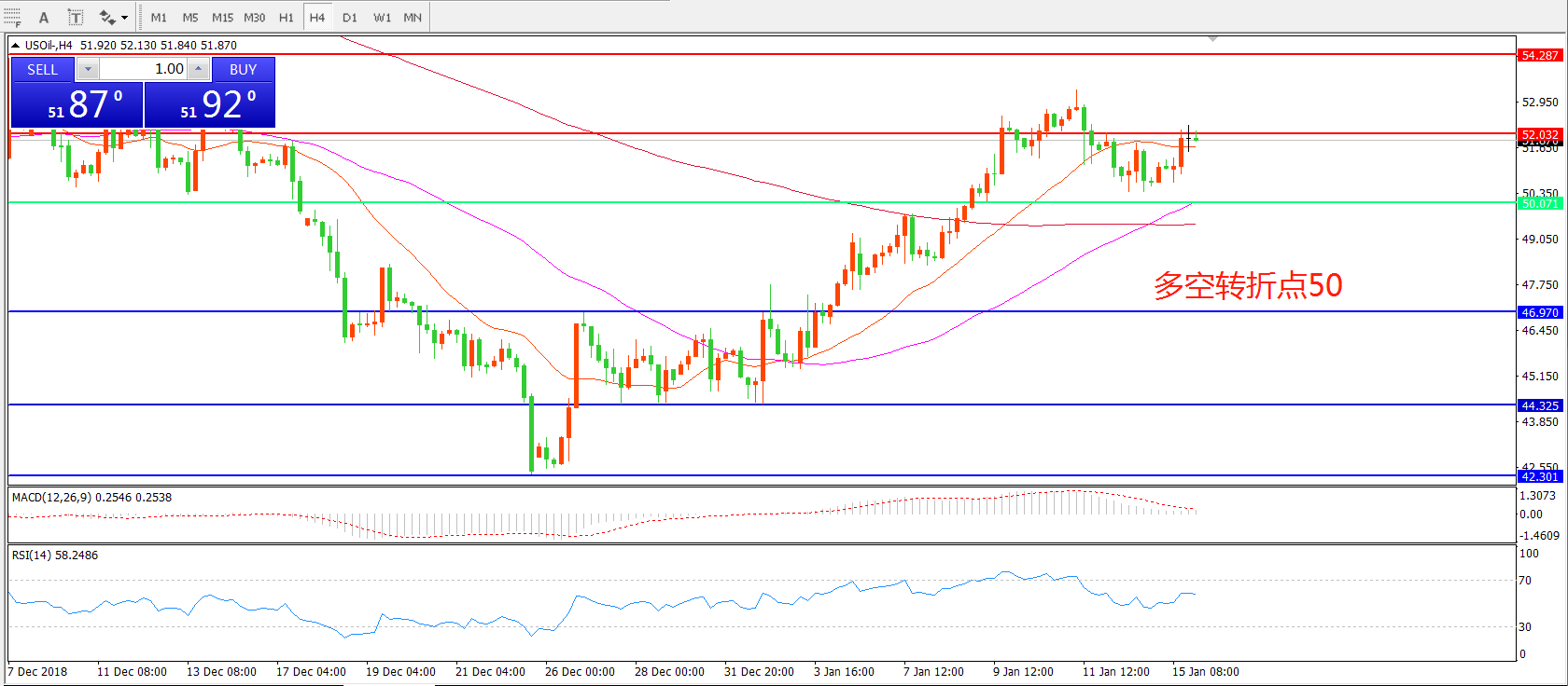 4小时图看,油价站稳50美金后陷入震荡,目前受阻于52美元,短期内呈现窄幅震荡形态, 均线系统仍呈多头排列,但MACD红柱缩短,短线有回落风险。