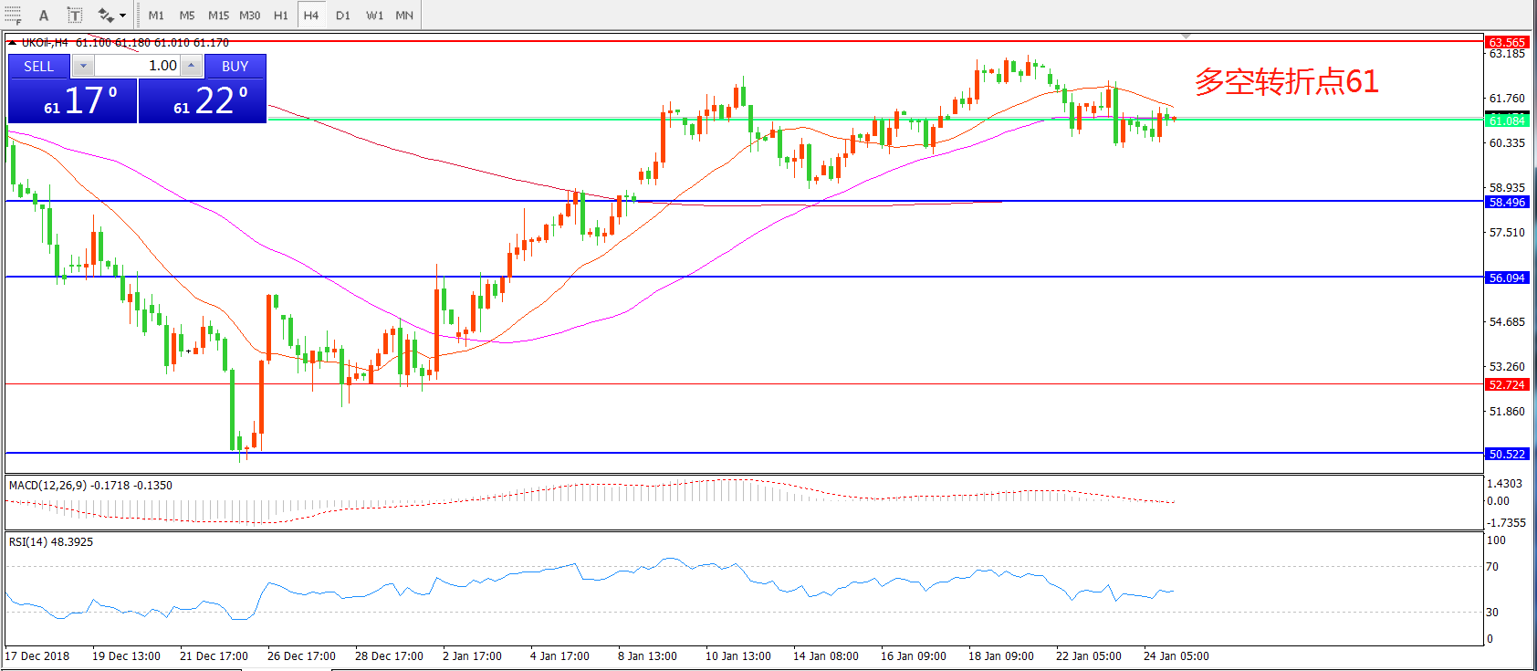 4小时图看,油价经过连续整理站稳61美元,短期整理后受制于63美元关口, 均线系统呈多头排列, MACD红柱增加,重点关注上方阻力。