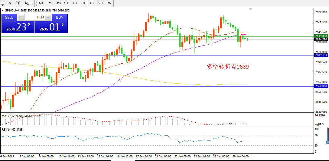 4小时图看,SP500跌破55周期均线下行,MACD红柱缩短,RSI指标延续下行,短期内如无力收复,下行调整仍将继续