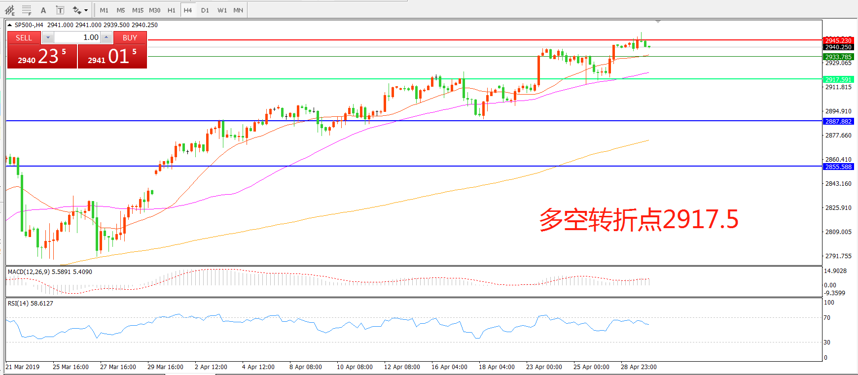 4小时图看,标普500以21均线为依托延续上行, 多头走势明显,均线系统呈多头排列,但MACD红柱走平,RSI指标掉头向下,日内仍以多头思路为主。
