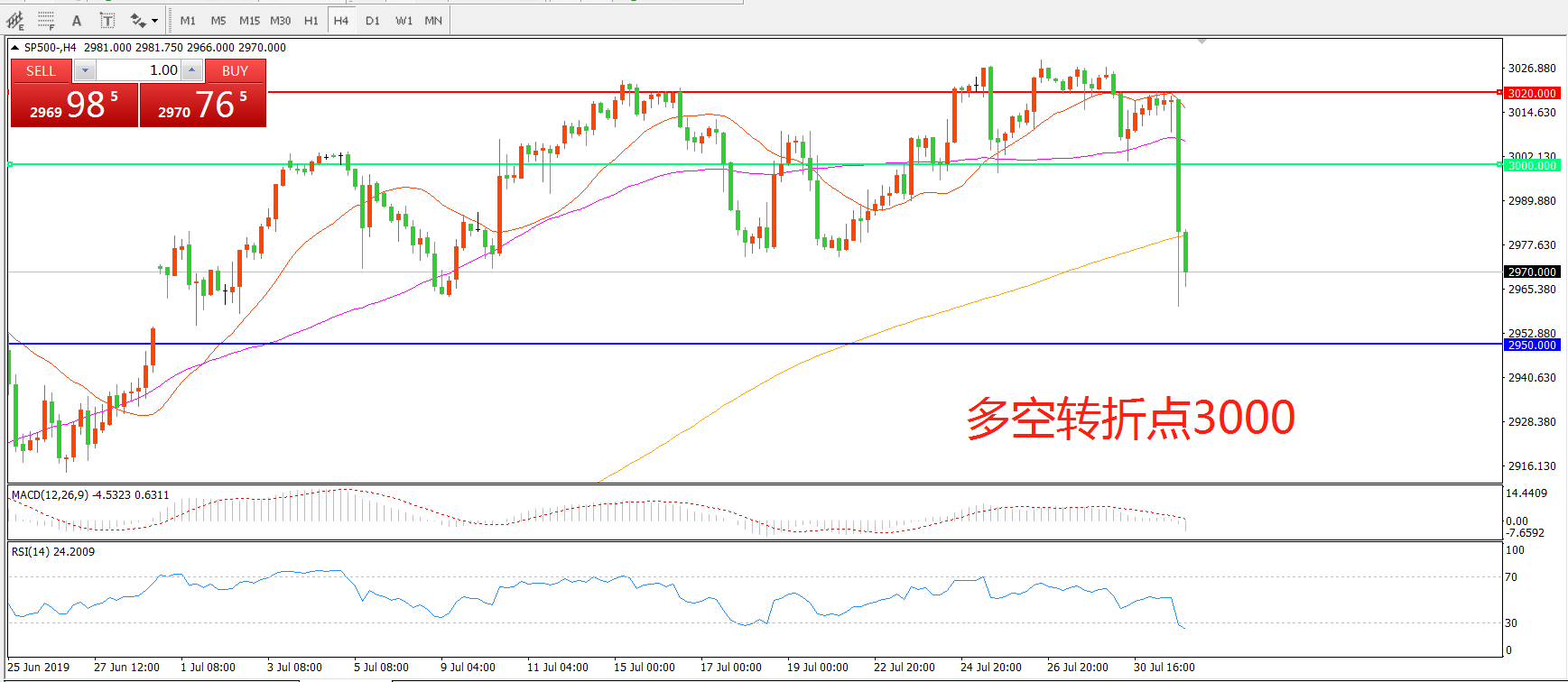 在美联储宣布降息的一刻,美股方面并没有出现太大的波动。但是戏剧性的一刻发生在鲍威尔的新闻发布会上。鲍威尔解释称,他并不是说这只是一次降息;这并不是长降息周期的开始但可能会再次降息。但随后他再次话锋一转,称不要设想我们不会再次加息。受这些言论的影响,美股短线大幅下跌,标普500长阴下破,最终收报2972.75.