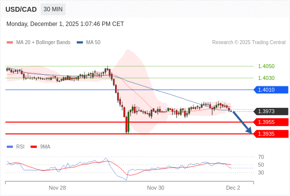 在 1.4010 之下,看跌,目标价位为 1.3955 ,然后为 1.3935 。