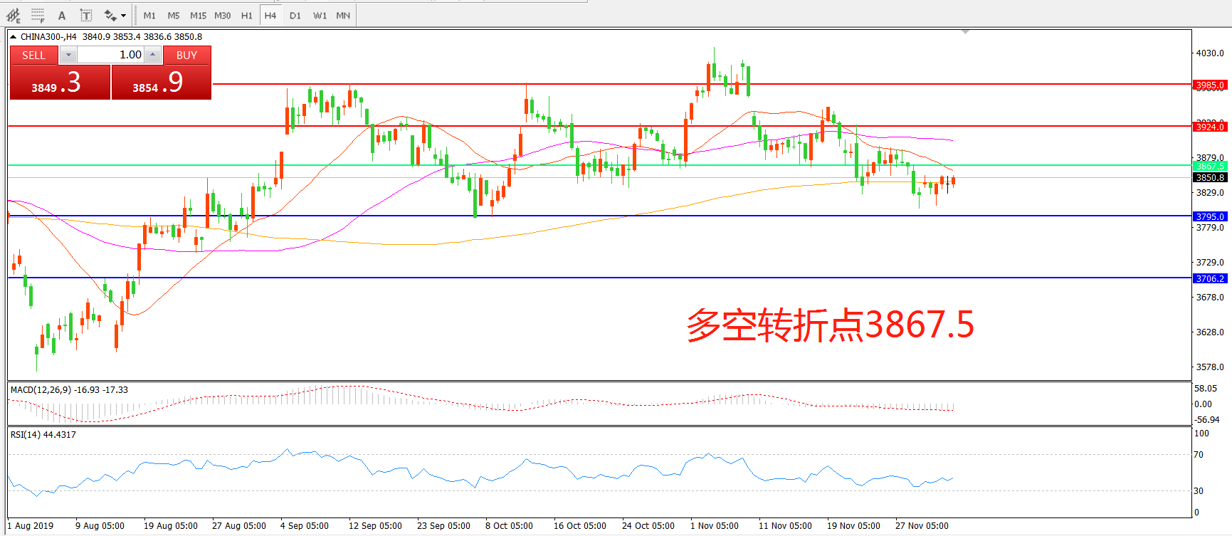 4小时图看,沪深300延续低位震荡,200周期均线成为短期争夺焦点,均线系统走平,MACD绿柱增加,RSI指标走平,日内延续震荡概率较大。