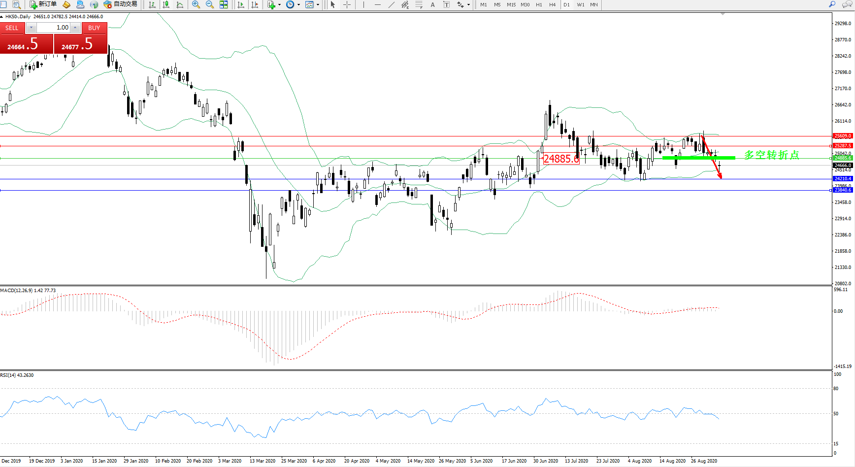 技术点评:长时间维持在布林带指标通道内持续宽幅震荡平移中,期间多次试探上下轨区间节点未果,高位空头动力伺机震荡下移,触及布林带指标下轨附近后开始有试探下行破位态势,处于布林带指标中下轨区间持续震荡下行中,关注中下轨区间转折点,MACD指标处于0轴线上側弱势徘徊有下移迹象,RSI指标处于50均衡线附近弱势整理后开始不断下行进入空头区域整理;