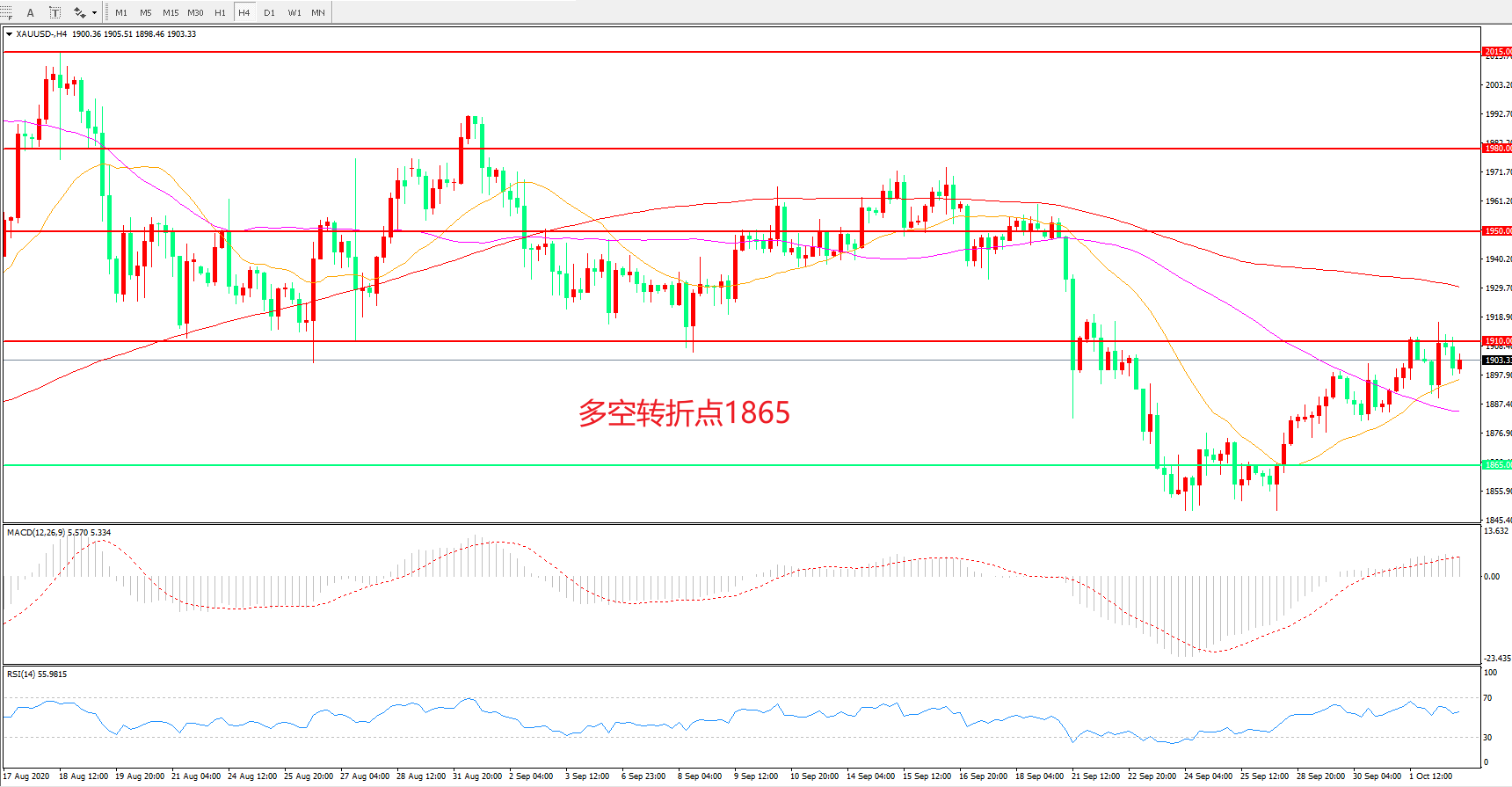 4小时图看,金价以触及1865支撑后震荡上行,短期走势有所回暖,1910成为短期阻力,21周期均线成为短期支撑,MACD红柱增加,RSI指标走平,近期延续上行概率较大。
