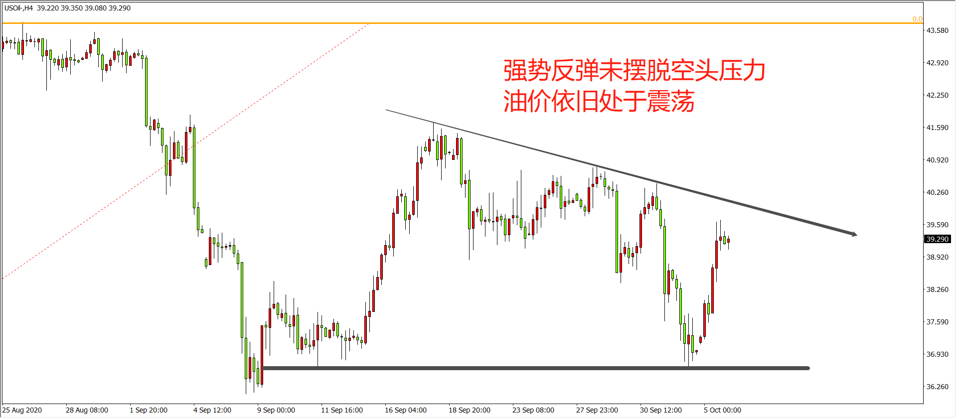 在特朗普确诊新冠病毒住院后,油价暴跌4%,随后在传出特朗普康复良好即将出院后,油价单日上演绝地反击大涨5%。在这其中,油市投资者的情绪跟着总统的病情跌宕起伏,油价的大涨除了特朗普出院提振市场情绪外,还有新一轮刺激法案即将达成的预期,挪威工人因薪资问题而不断升级的罢工行动也提振了油价,多重利好之下美油正在向40美元/一桶靠近,作为油市的中期走势分水岭,40美元成为了今年油市多头的鸿沟,再次反弹压力位,油市还需更实在的利好来维持上行动能。