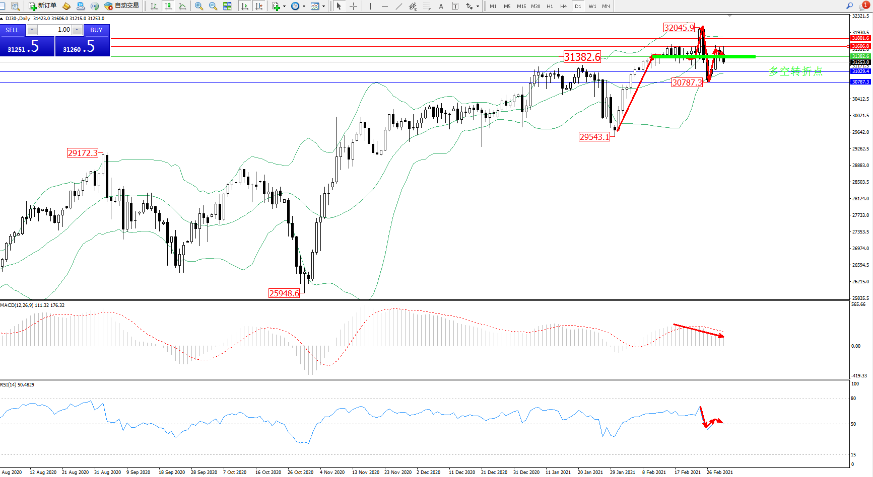 道琼斯指数DJ30—— 日K线图显示: