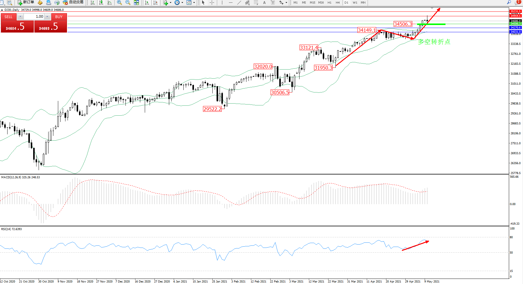 道琼斯指数5月10日(周一)收盘下跌32.60点,跌幅0.09%,报34745.16点;美股三大指数全部收跌,科技股领跌美国股市,随着大宗商品价格走高,市场担忧通胀是否会阻碍美国经济复苏并遏制美股创纪录的涨势。经济完全复苏的前景可能已被市场消化,疲软的就业数据或只是短暂遏制了对通胀过热和升息的担忧。美国达拉斯联储主席卡普兰:在美联储减码QE之前,还需要取得更多的实质性进展。但健康的做法是,宜早不宜迟地开始讨论减码QE。美国4月非农就业报告令人感到失望,数据本身可能体现出供应问题。美国延长实施失业救济金措施,但缺乏儿童护理政策。仍然预计2021年就业市场将强劲增长