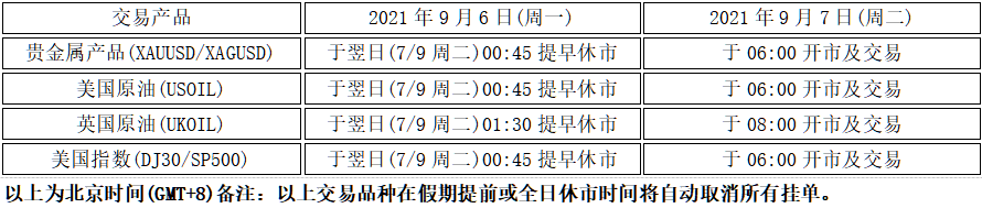 因应美国劳动日假期(2021年9月6日,周一),本公司以下产品的交易时间将于假期期间作以下安排,敬请留意。