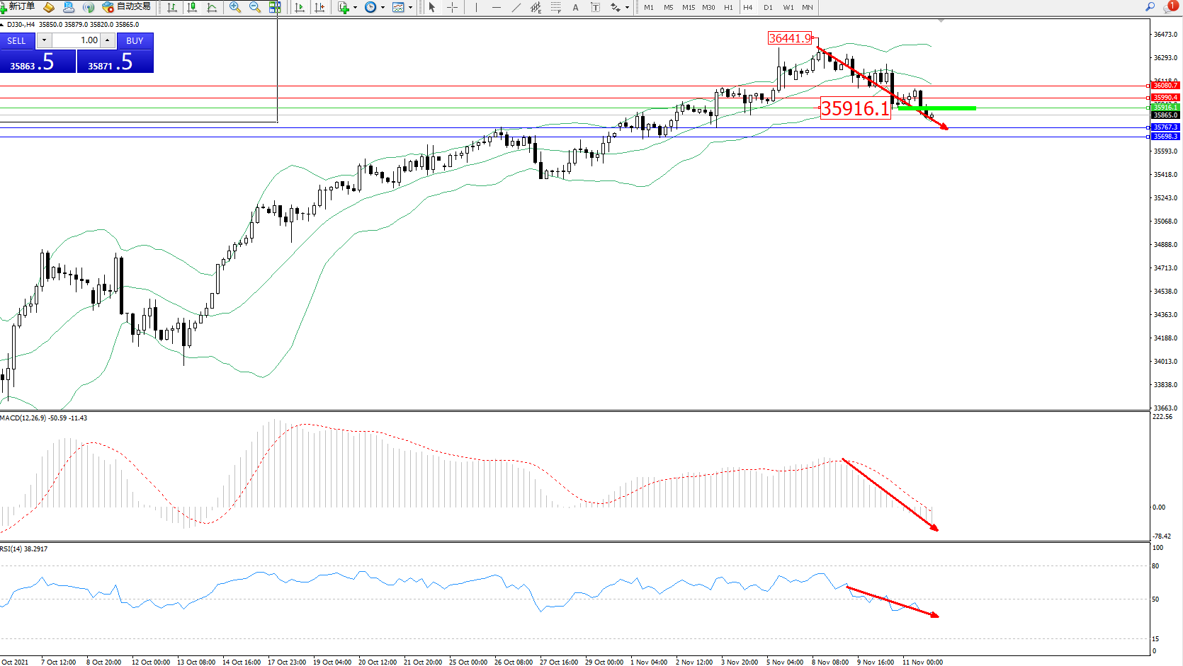 交易策略:35916下方看跌,目标35767、35698