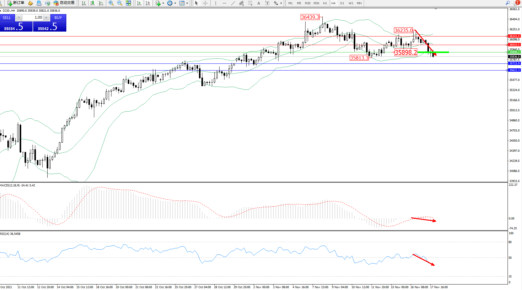 道琼斯指数11月17日(周三)收盘下跌210.70点,跌幅0.58%,报35931.52点;美股收盘,三大股指集体下跌,投资者开始要求更高的收益率来持有美国政府的最短期限债券,认为如果未来几周不暂停或提高债务上限,美国政府将面临延迟还款的风险。12月15日到期的美国国债收益率一度攀升2.8个基点至0.083%,其他多数在这前后到期的国债收益率则较低。由于时点的不确定性,投资者对潜在的违约风险相对乐观。部分策略师认定2022年初左右可能出现违约,而有些人则专注于年底的时点。