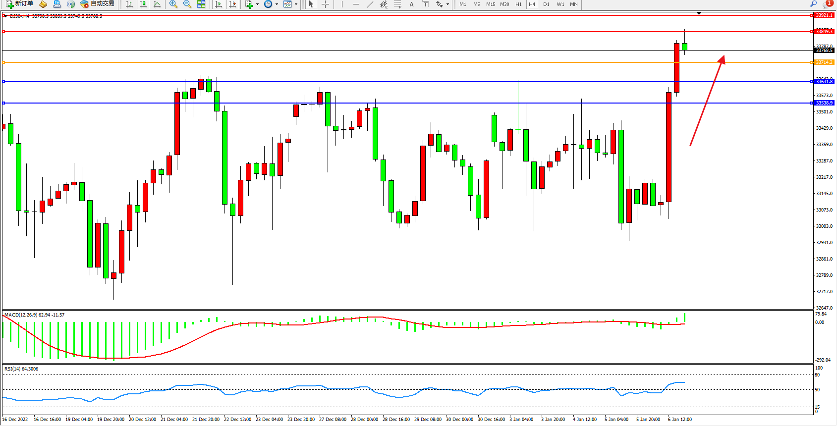 道琼斯指数1月6日(周五)收盘上涨699.71点,涨幅2.12%,报33629.79点;美国去年12月新增就业岗位22.3万个,为两年来的最小增幅,但在经济面临不断上升的逆风之际,劳动力市场仍显示出惊人的活力。