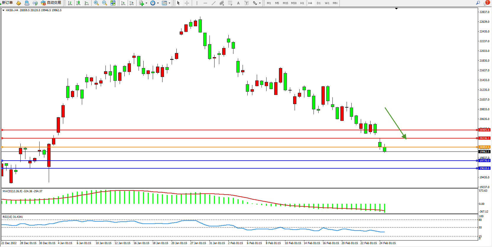香港恒生指数2月24日(周五)收盘下跌341.31点,跌幅1.68%,报20010.04点;美加息行动或超预期,人民币大幅走贬。港股全天呈单边下跌行情,市场情绪降至冰点。恒生科技指数大跌3.34%,恒指、国指分别跌1.68%和2.28%,恒指险守2万点大关,三者均刷新调整低价。大型科技股尾盘跌幅加大,网易重挫逾11%,百度跌6%,香港特区政府差饷物业估价署24日公布,2023年1月份私人住宅售价指数为336.1点,按月回升约0.6%,结束连续7个月下跌。