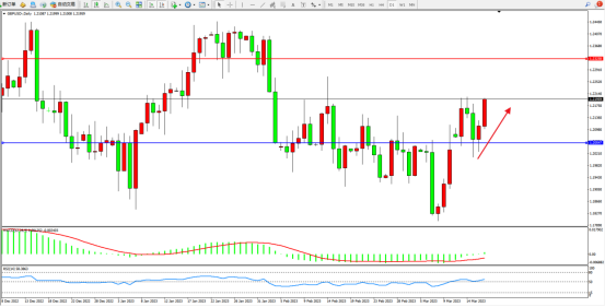 低位多头动力强势震荡上扬,短期看涨情绪涌现,市场多头不断震荡拉升,上方压制关注1.23258附近,低位支撑关注1.20547附近,MACD指标处于0轴线上侧徘徊,RSI指标处于50均衡线上侧弱势整理;如图: