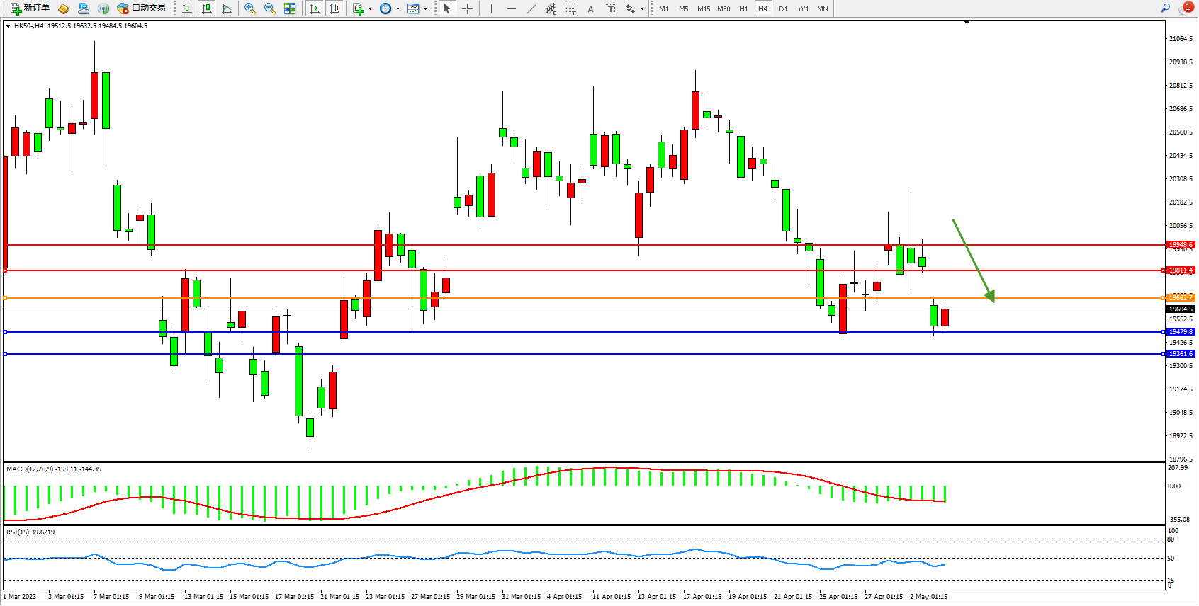香港恒生指数5月3日(周三)收盘下跌234.65点,跌幅1.18%,报19699.16点;港股三大指数今日集体低开逾1%后,全天在开盘价附近横盘震荡,恒指收跌1.18%,恒生科技指数收跌1.63%,国企指数收跌1.36%。黄金股在避险情绪的推动下逆市走高,招金矿业涨超4%,中国黄金国际涨超2%,紫金矿业、山东黄金跟涨。