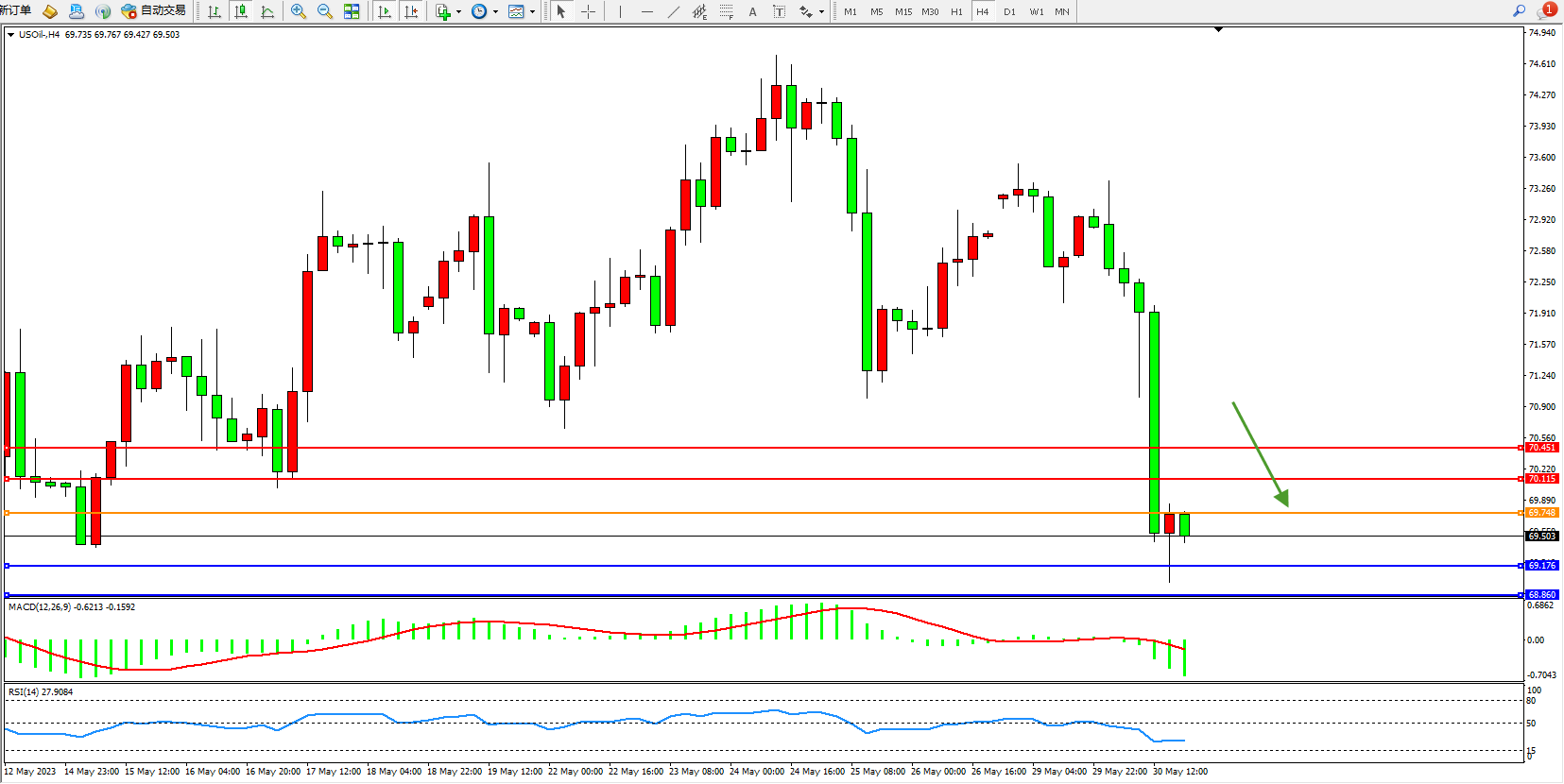 交易策略:69.748下方看跌,目标69.176  68.860