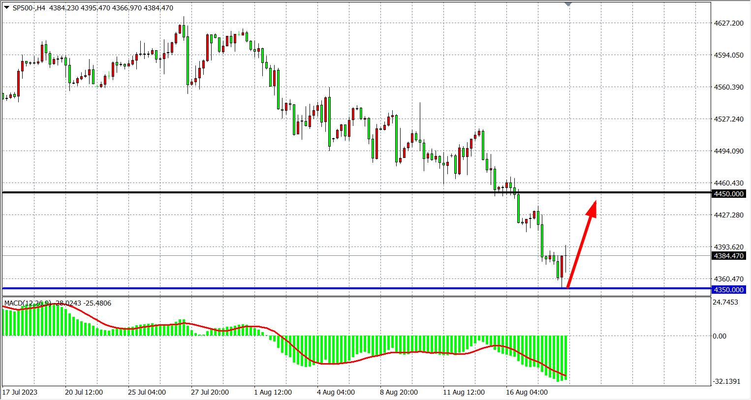 4小时图看,标普跌至4350附近反弹明显,MACD量能在零轴下放量,行情走势仍较疲弱,阻力关注4450附近,支撑关注4350附近。