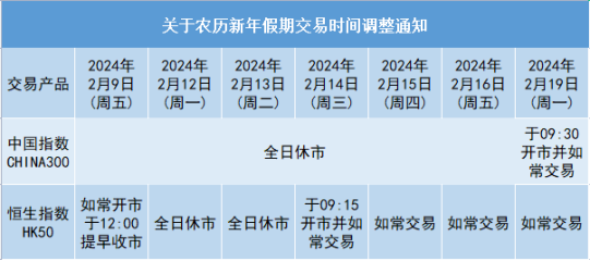 因应2024年2月9日至2月17日期间为国内及香港农历新年假期,本公司以下产品的交易时间将于假期期间作以下安排,敬请留意。