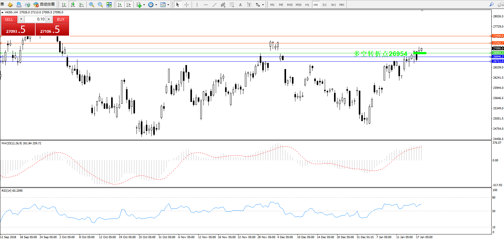 恒指HK50 ——4小时K线图显示: